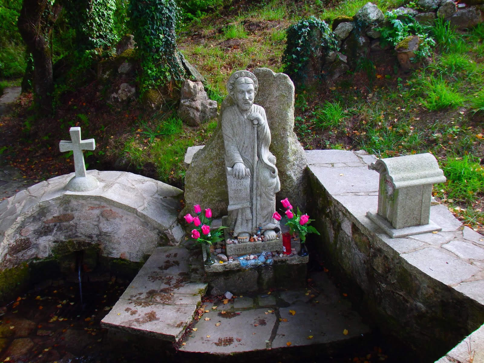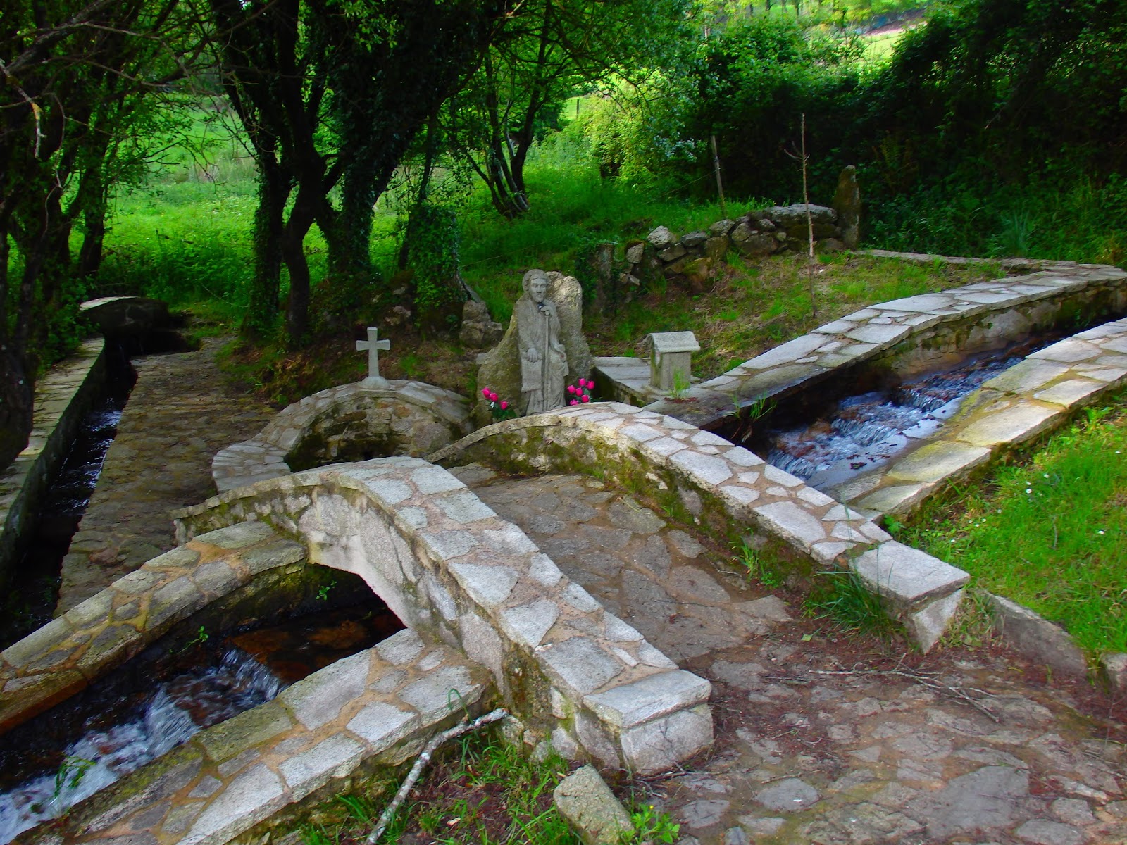 We left Ferreira behind and headed towards Leboreira, Augas Santas and Merlán, already entering the province of A Coruña. In the Augas Santas parish, after having crossed meadows and cattle farms, near the church of San Xurxo, we come across a set of stone fountain, tables and benches, presided over by an image of the Apostle Santiago. Pilgrims take advantage of this wonder of the Camino to leave their offerings at the foot of the statue of the Apostle. An idyllic place to rest, lulled by the sound of falling water, while we enjoy the cool and humid riverbank, relaxing under the leaves of the trees. This image of the Apostle in this idyllic setting indicates pilgrims that Santiago de Compostela is getting closer and closer.